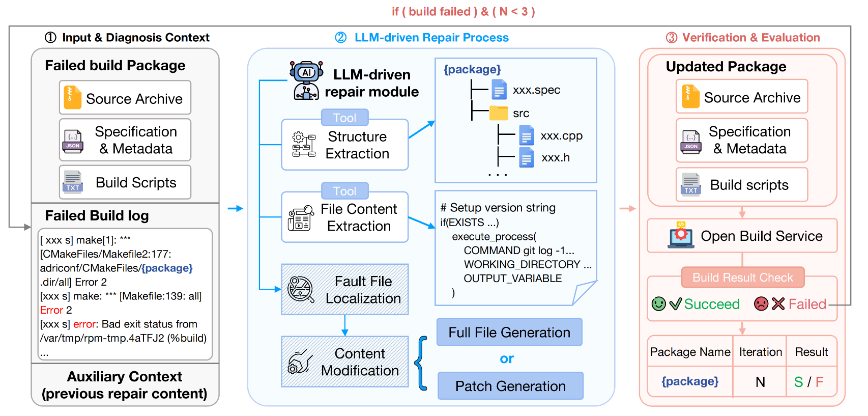 Each iteration reuses the latest build log and prior repair output as contextual feedback, allowing the model to refine its reasoning and avoid repeating ineffective edits.