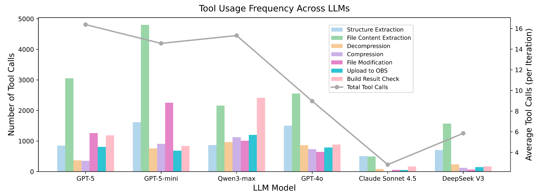 These findings reveal that LLMs differ not only in their linguistic reasoning capabilities but also in their operational strategies during tool-assisted repair, which is an important factor contributing to their divergent success rates in cross-ISA build repair.